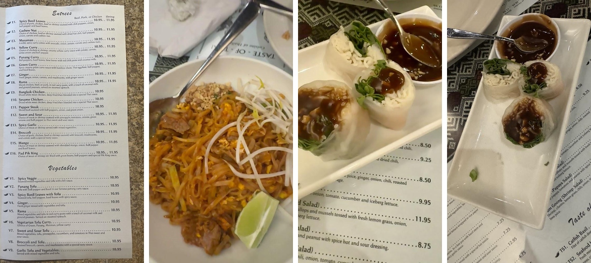 Shrimp, rice noodles, bean sprouts, basil leaves and lettuce wrapped in rice paper. Served with tamarind sauce topped with peanuts.